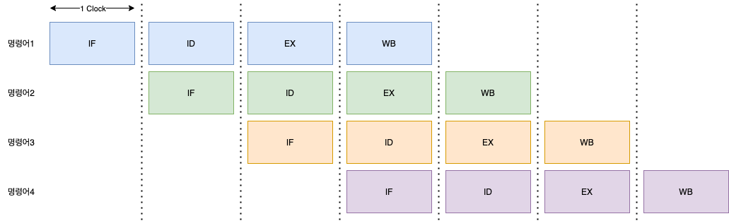 위와 같이 명령어 처리 단계를 4단계로 나누면 동시에 처리되는 명령어 최대 개수는 4개입니다.