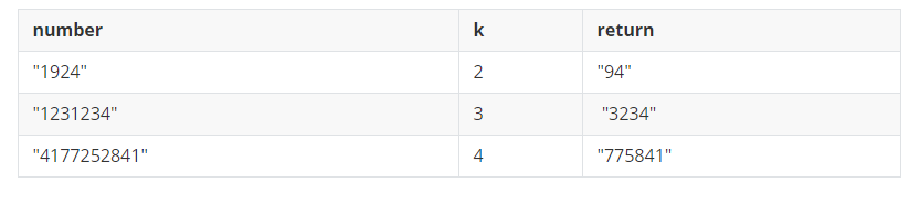 문자열 형식으로 숫자 number와 제거할 수의 개수 k가 solution 함수의 매개변수로 주어집니다. number에서 k 개의 수를 제거했을 때 만들 수 있는 수 중 가장 큰 숫자를 문자열 형태로 return 하도록 solution 함수를 완성하세요.
