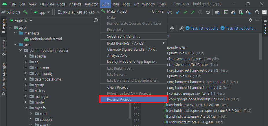 ▶ 해제하고 다시 프로젝트를 빌드 해준다.(Build > Rebuild Project)