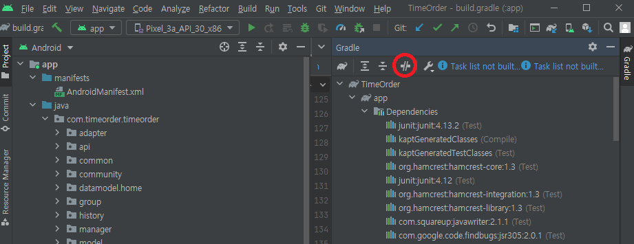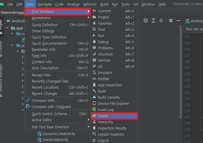 ▶ View > Tool Windows > Gradle 을 선택해서 Gradle 빌드 창을 띄운다.
