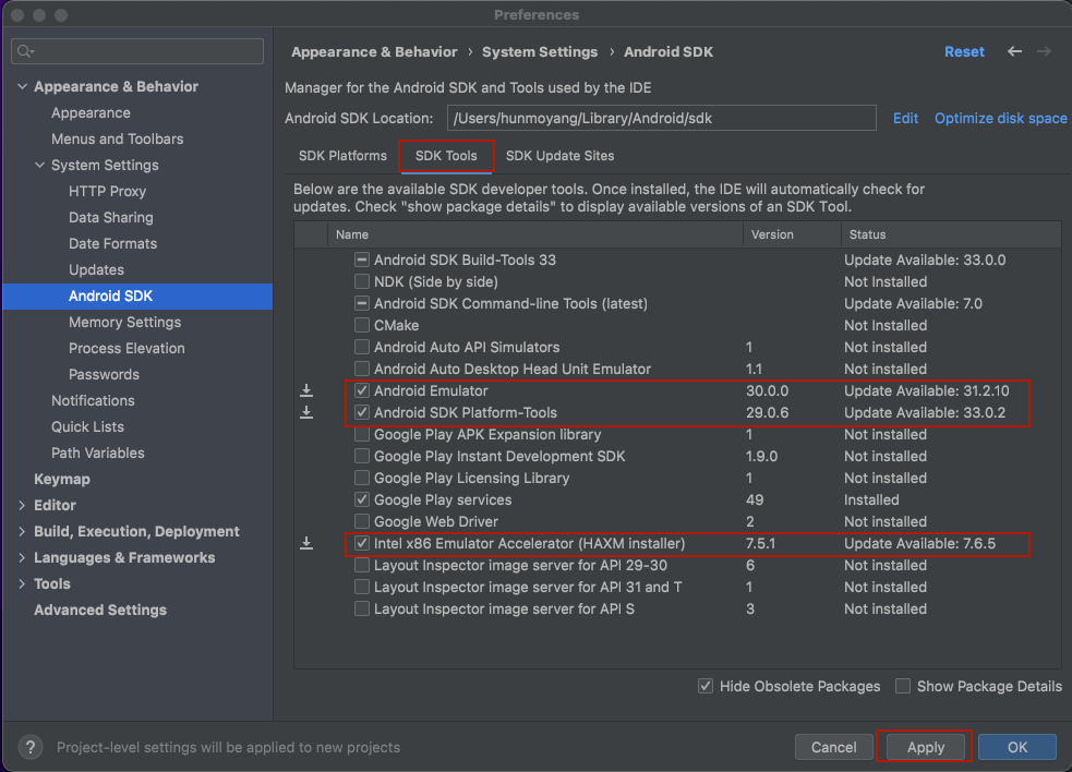 근본적인 문제는 AVD를 실행하기 위한 SDK Tool이 부족해서였습니다. 해결방법은 맥을 기준으로 Tool > SDK Manger를 들어가서 다음 3개의 SDK tools을 다운받아야 합니다.