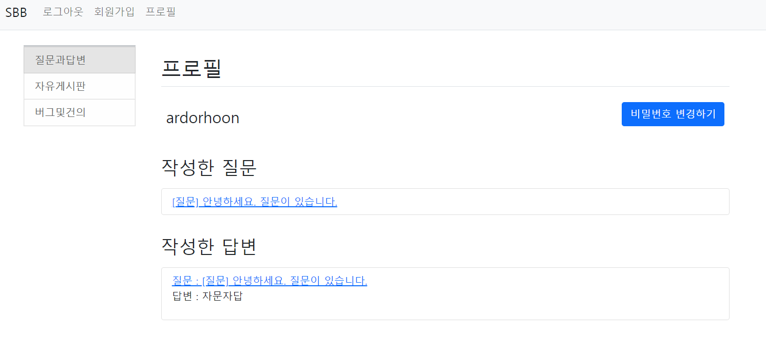 프로필에는 닉네임과 본인이 작성한 질문 목록과 작성한 답변, 비밀번호를 변경할 수 있습니다.